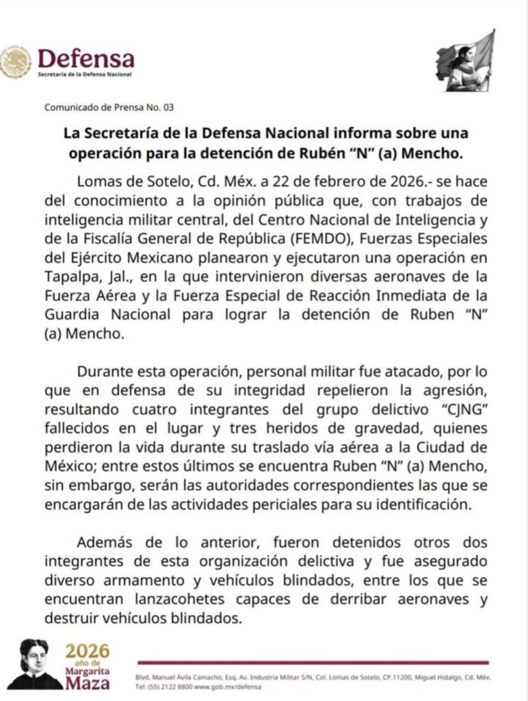 La Secretaría de la Defensa Nacional informó que “El Mencho” perdió la vida mientras era trasladado a la Ciudad de México, luego de su aseguramiento por fuerzas federales.