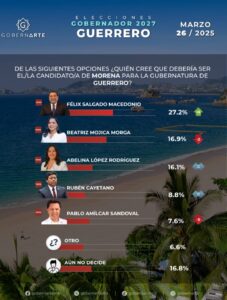 Los resultados de la medición presentados por la encuestadora Gobernarte este miércoles, indican que 27.2 por ciento de los ciudadanos guerrerenses consideran que el senador, Félix Salgado Macedonio, debería ser el candidato de Morena rumbo a 2027, lo que representa más de 10 puntos arriba de la más cercana competidora, Beatriz Mojica Morga. El resto de los nombres medidos están por debajo de la opción “aún no decide”, que tiene 16.8 puntos porcentuales.