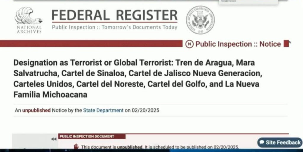 El gobierno de Estados Unidos ha designado oficialmente a seis cárteles mexicanos como Organizaciones Terroristas Extranjeras. La notificación, emitida por el secretario de Estado, Marco Rubio, y publicada en el Registro Federal, entrará en vigor el jueves 20 de febrero de 2025. Los cárteles afectados son: