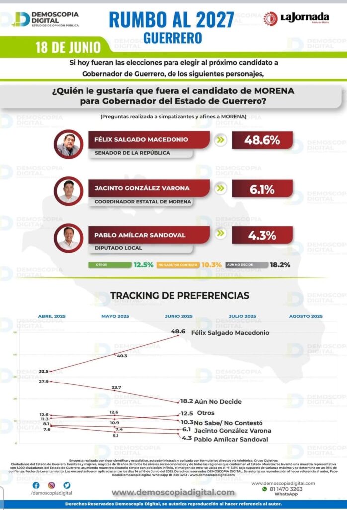 De manera general, en pregunta de conocimiento, 75.3 por ciento de los encuestados conoce o ha escuchado hablar de Salgado Macedonio.