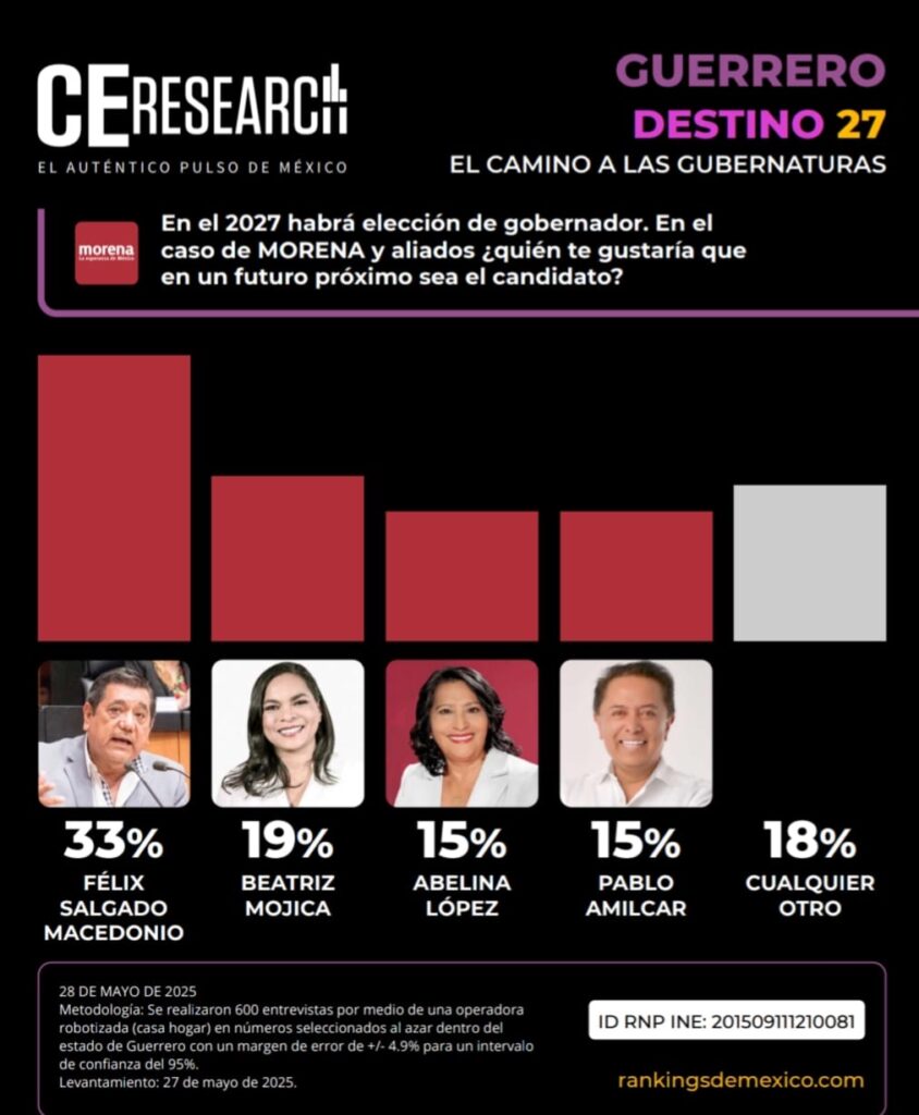 En la medición con otros partidos políticos con la pregunta “Si hoy fuera la elección de Gobernador, ¿por quién de los candidatos votaría?”, Félix Salgado Macedonio alcanza 48% de simpatía entre los guerrerenses, en un escenario de coalición, mientras que Morena en general tiene 51% de preferencia del electorado.