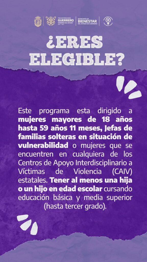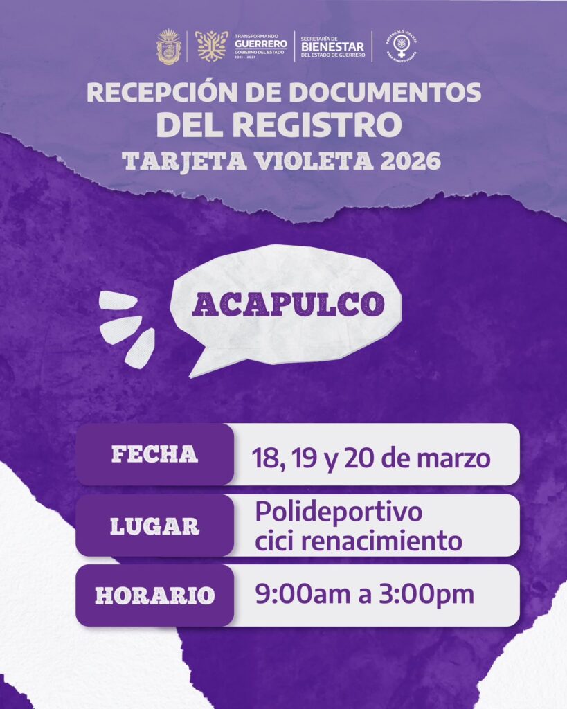 Chilpancingo, Gro., 2026.– Con el objetivo de fortalecer la autonomía económica de las mujeres y brindar apoyo a quienes se encuentran en situación de vulnerabilidad, el Gobierno del Estado de Guerrero, a través de la Secretaría de Bienestar, presentó la Convocatoria 2026 del Programa Tarjeta Violeta, dirigida a mujeres jefas de familia solteras.