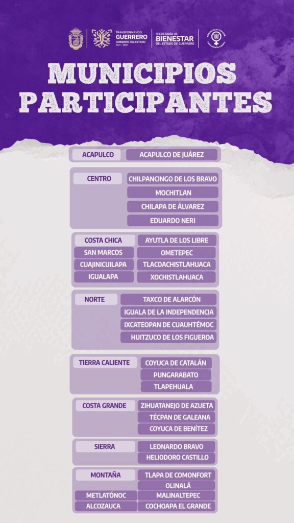 El Programa Tarjeta Violeta contempla la participación de mujeres de municipios ubicados en las ocho regiones del estado, entre ellos: Acapulco de Juárez, Chilpancingo de los Bravo, Mochitlán, Chilapa de Álvarez, Eduardo Neri, San Marcos, Ometepec, Cuajinicuilapa, Igualapa, Ayutla de los Libres, Tlacoachistlahuaca, Xochistlahuaca, Zihuatanejo de Azueta, Tecpan de Galeana, Coyuca de Benítez, Taxco de Alarcón, Iguala de la Independencia, Ixcateopan de Cuauhtémoc, Huitzuco de los Figueroa, Leonardo Bravo, Heliodoro Castillo, Tlapa de Comonfort, Olinalá, Metlatónoc, Malinaltepec, Alcozauca de Guerrero, Cochoapa el Grande, Coyuca de Catalán, Pungarabato y Tlalchapa.