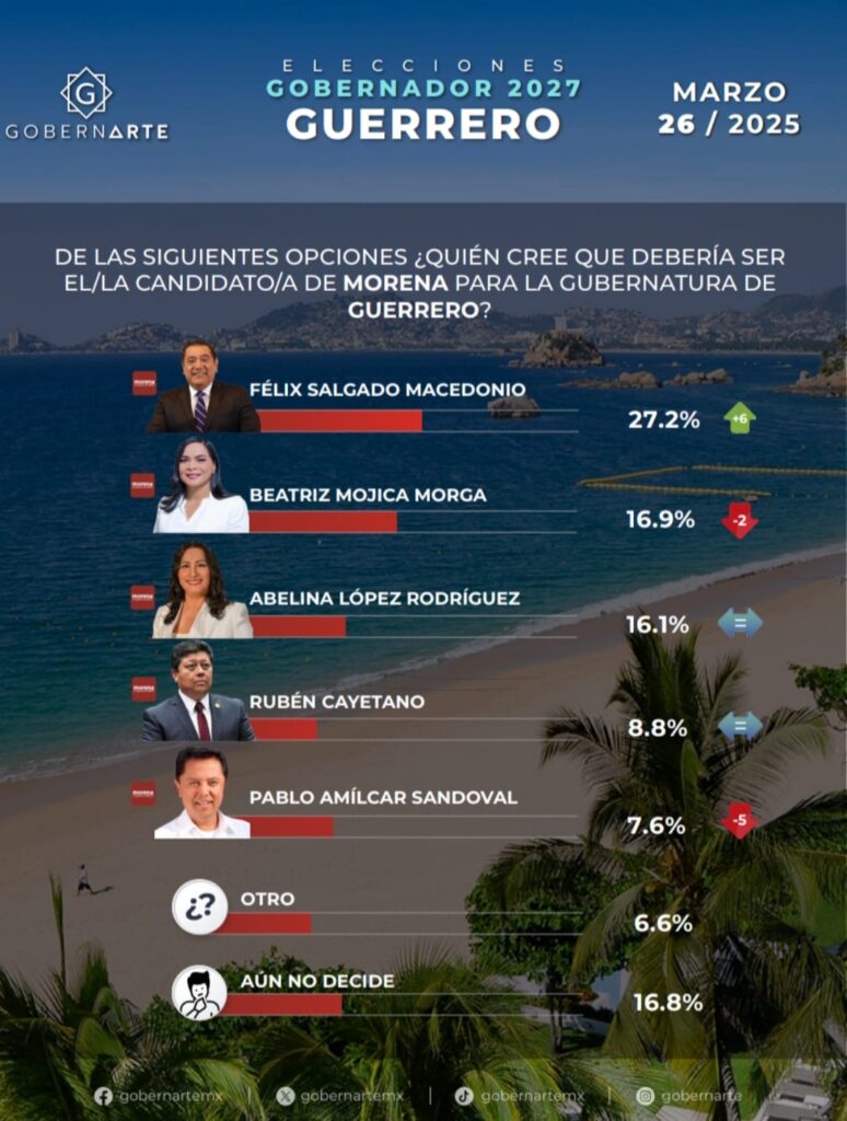 En la encuesta aplicada entre el 20 y el 24 de marzo de forma aleatoria, se indica que, si hoy fueran las elecciones a gobernador de Guerrero, 48.5 por ciento de los guerrerenses votaría por Morena aún sin coalición; en segundo lugar se ubicó el PRI, con solo 10.9 puntos porcentuales.